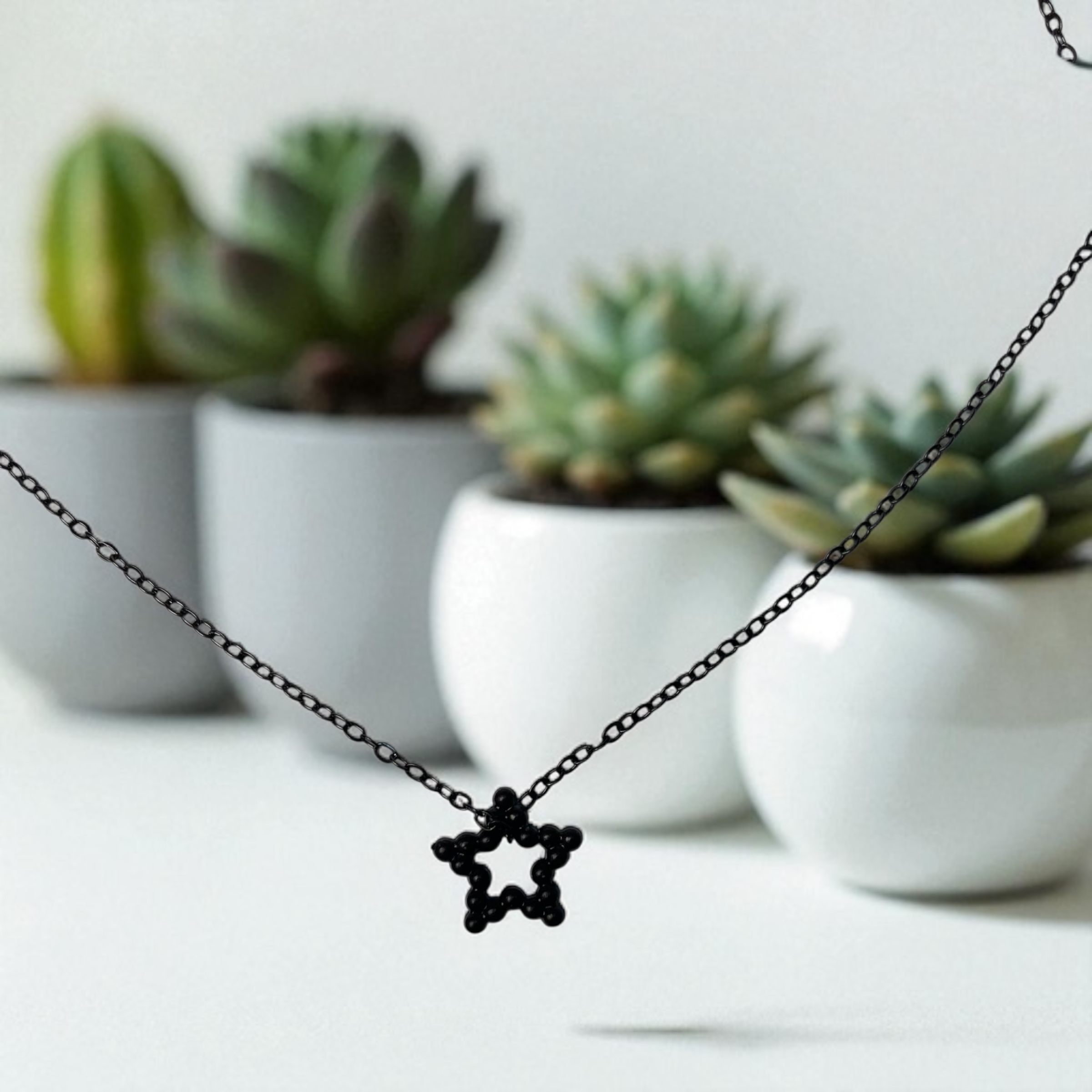 این گردنبند ظریف با زنجیر مشکی و آویزی به شکل ستاره، طراحیای ساده اما بسیار چشمنواز دارد. ستارهی کوچک ساختهشده از مهرههای مشکی، جلوهای مینیمال و مدرن به آن بخشیده است. نماد ستاره همواره نمایانگر آرزوها، امید و روشنایی در تاریکی بوده و انتخاب آن بهعنوان زیور، مفهومی عمیق در دل خود دارد. رنگ مشکی نیز جذابیتی رمزآلود و کلاسیک به این اثر هنری بخشیده است. این گردنبند انتخابی بینقص برای کسانی است که زیبایی را در سادگی و معنا جستوجو میکنند.