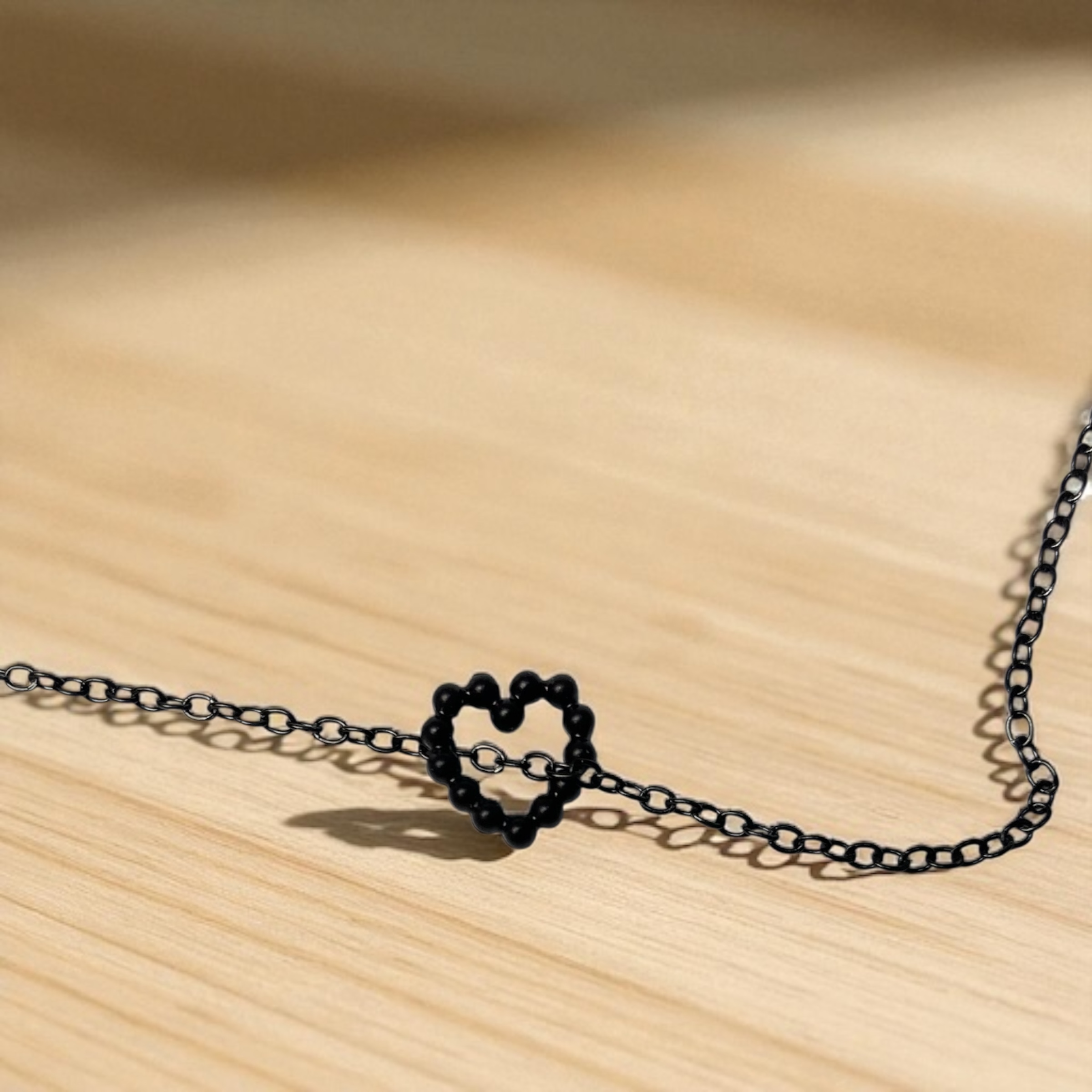 این گردنبند با طراحی ظریف و مینیمال، دارای زنجیری مشکی‌رنگ و پلاکی به شکل قلب کوچک است که از مهره‌های مشکی ریز تشکیل شده. سادگی و در عین حال جذابیت این گردنبند، آن را به گزینه‌ای مناسب برای استفاده روزمره یا هدیه‌ای پرمعنا تبدیل کرده است. رنگ مشکی، حس خاصی از وقار، مرموز بودن و عمق احساس را منتقل می‌کند. فرم قلب نیز همواره نمادی جهانی از عشق، دوستی و احساسات پاک است. این گردنبند، بی‌کلام اما پرمعنا، حامل پیام‌هایی از محبت و زیبایی در ساده‌ترین شکل ممکن است.