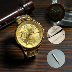 ساعت مچی مردانه برند نویفورس naviforce کرنوگراف فول استیل همراه با بند چرم طلایی