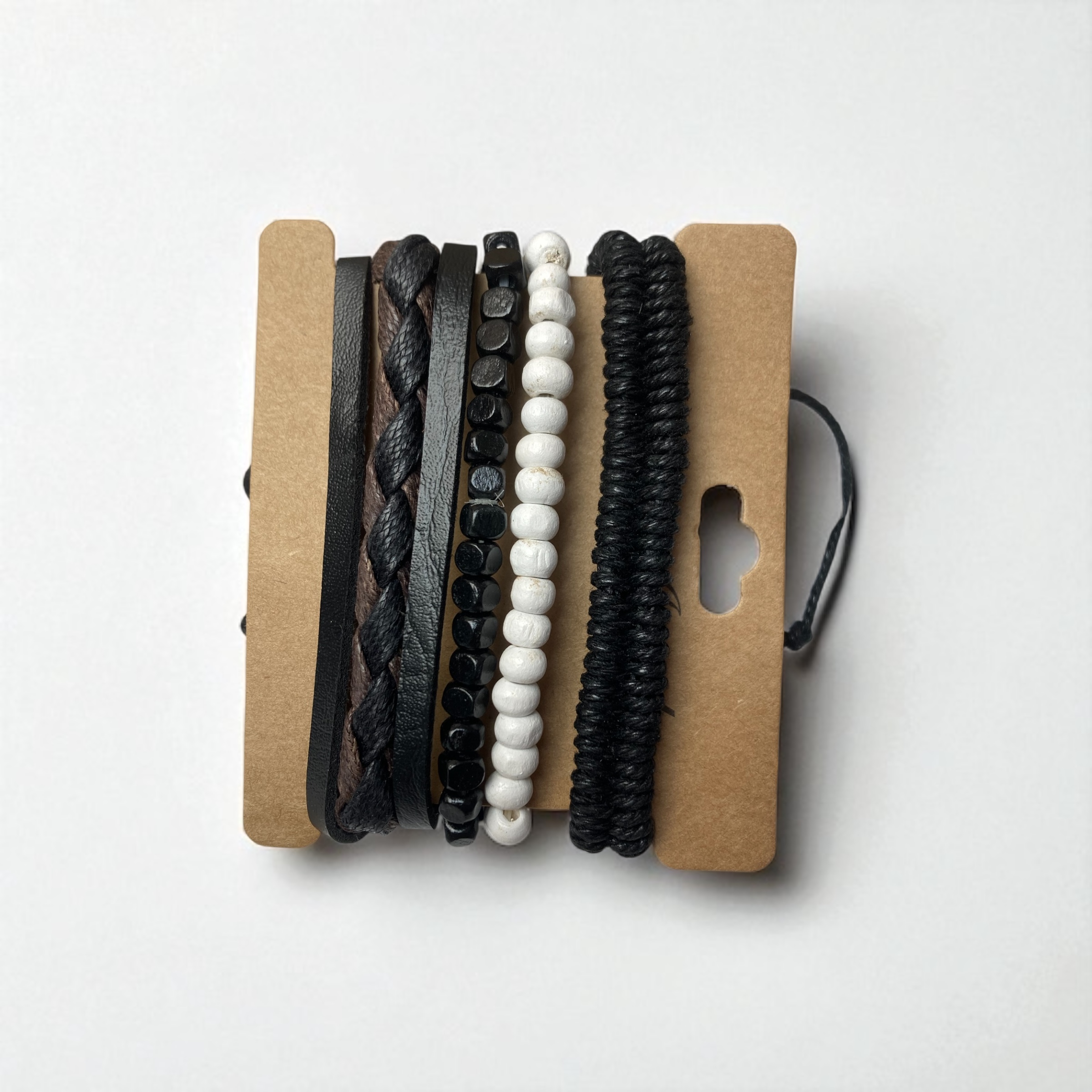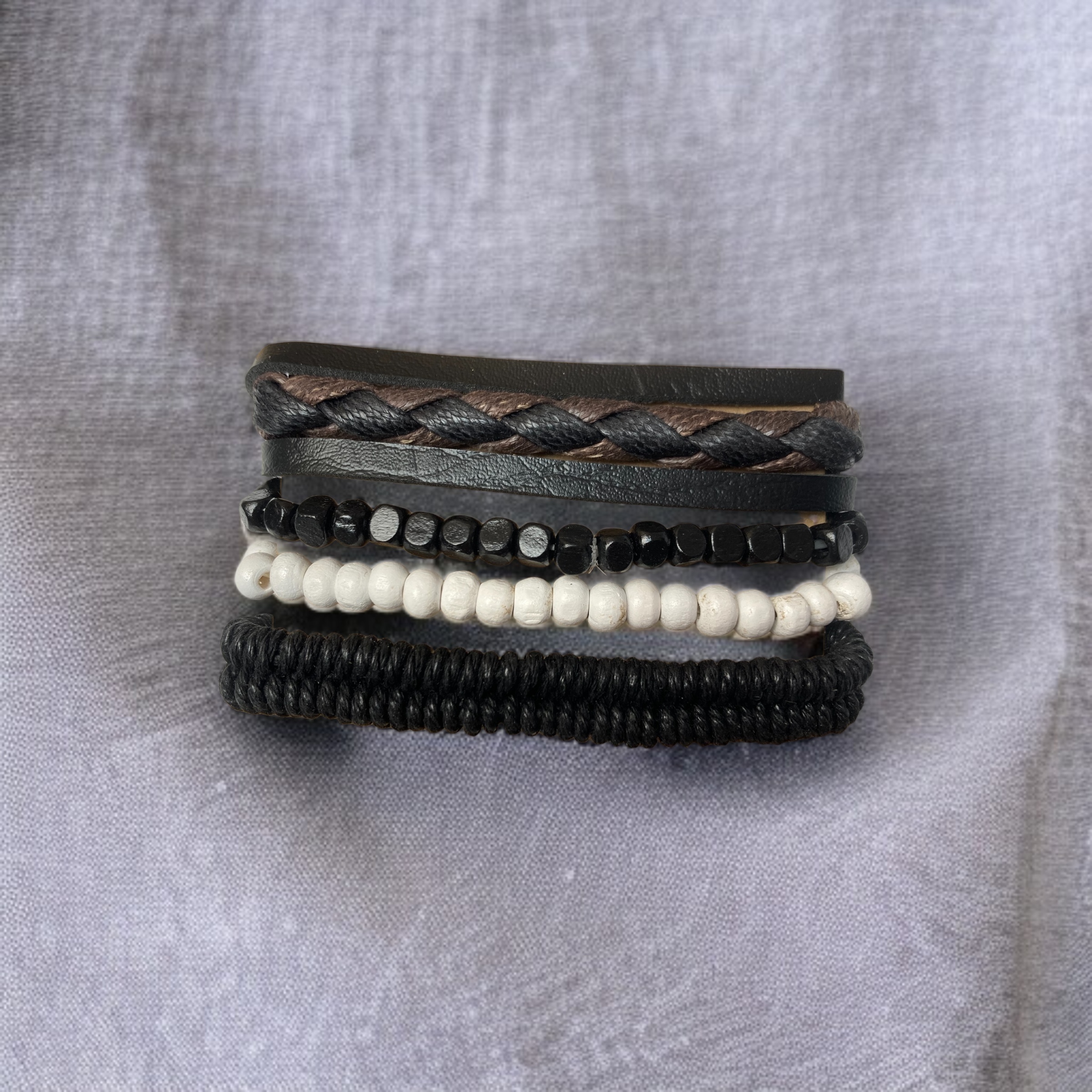 این دستبند از چند لایه مجزا تشکیل شده است: یک لایهی چرمی با طرح بافتدار به رنگهای مشکی و قهوهای، یک نوار چرمی صاف و ساده، دو ردیف مهرههای سفید و مشکی با ظاهر مات و براق، و در نهایت یک بند بافتنی از جنس پاراکورد که به کار استحکام و حالتی اسپرت میبخشد. این ترکیب زیبا، جذابیت بصری چشمگیری ایجاد میکند و حس تنوع و هماهنگی را همزمان منتقل مینماید.