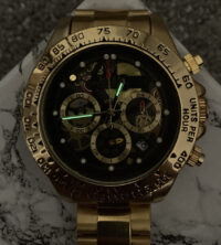 این ساعت با بدنه استیل ضدزنگ طلایی، صفحه مشکی با جزئیات طلایی و قابلیتهای حرفهای کرنوگراف، انتخابی ایدهآل برای آقایانی است که میخواهند در هر جمعی بدرخشند و ظاهری خاص و متفاوت داشته باشند. در ادامه به بررسی دقیقتر این شاهکار میپردازیم.