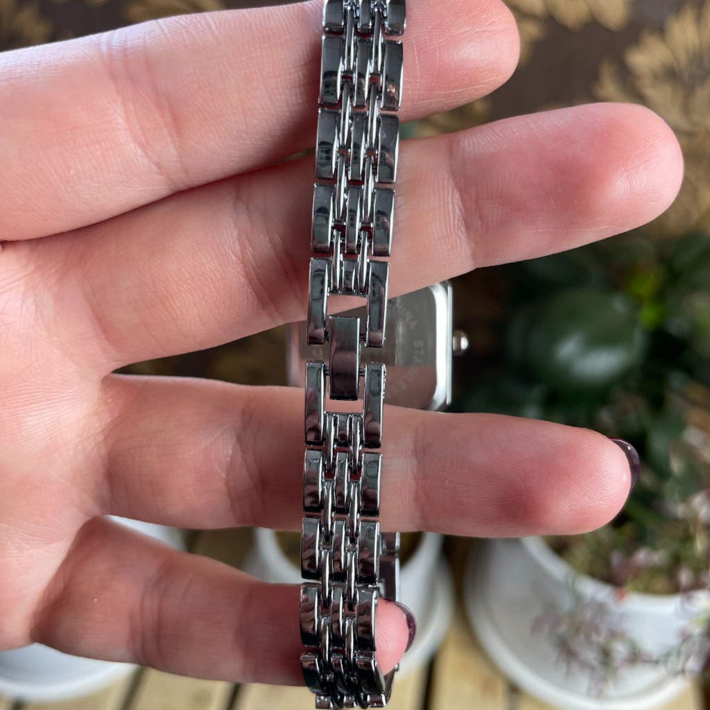 بند ساعت با طراحی زنجیرهای دو ردیف موازی و ظریف، کاملاً هماهنگ با قاب است. اتصالات بند بهصورت انعطافپذیر طراحی شدهاند تا ساعت هنگام استفاده روزانه در دست کاملاً راحت و بدون ایجاد فشار حس شود. قفل تاشو نیز طوری طراحی شده که هم امنیت بالایی داشته باشد و هم باز و بسته کردن آن بهراحتی انجام گیرد.