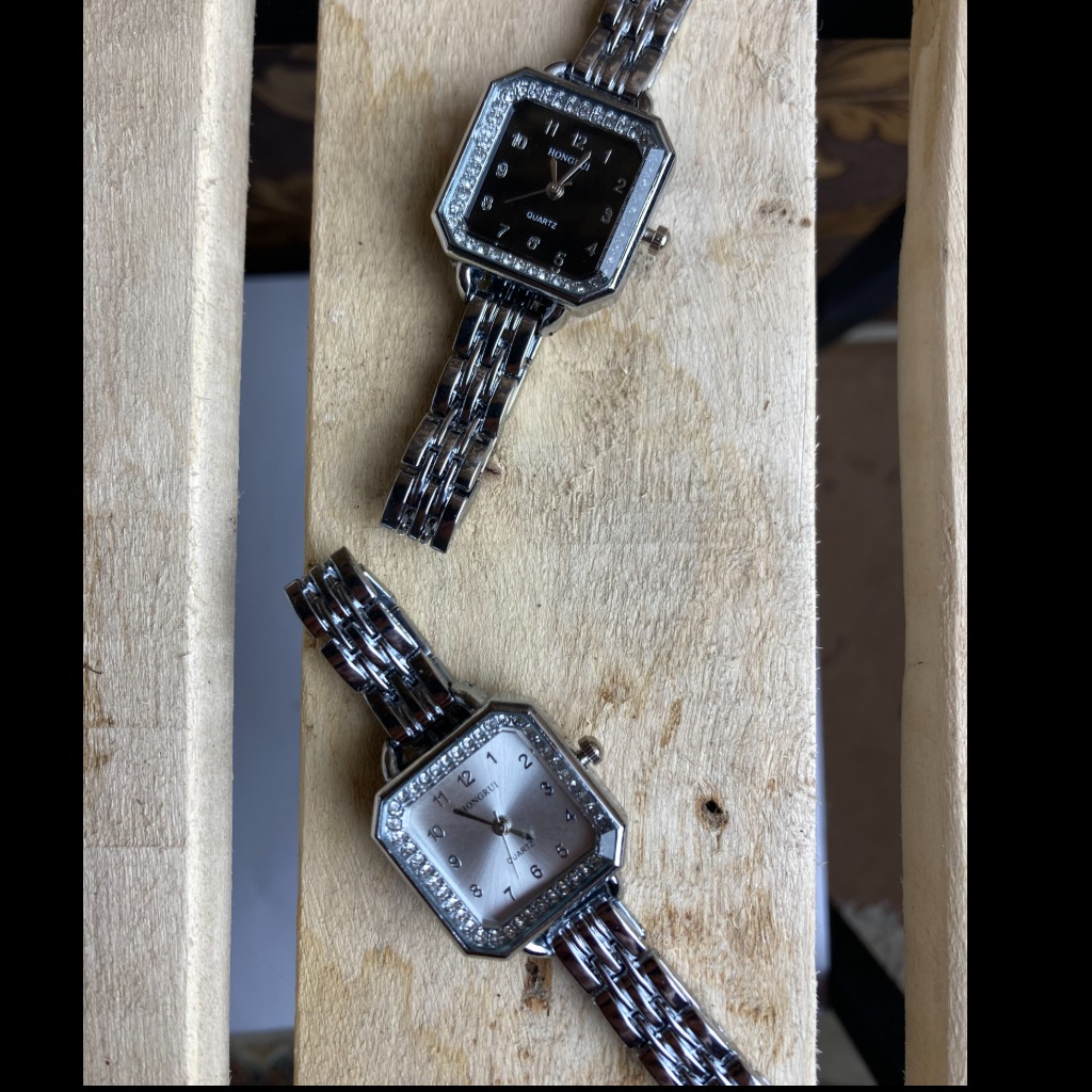 دو ساعت زنانهای که از برند HONGRUI در تصویر مشاهده میکنیم، نمونهای خیرهکننده از ترکیب طراحی جواهرگونه و عملکرد دقیق هستند. قاب ششضلعی پرنگین، بند فلزی خوشفرم و صفحههای مشکی و صدفی، این ساعتها را به انتخابی ایدهآل برای خانمهایی تبدیل کرده که میخواهند در هر جمعی بدرخشند؛ بیآنکه نیاز باشد حتماً از جواهرات پرزرق و برق و گرانقیمت استفاده کنند.