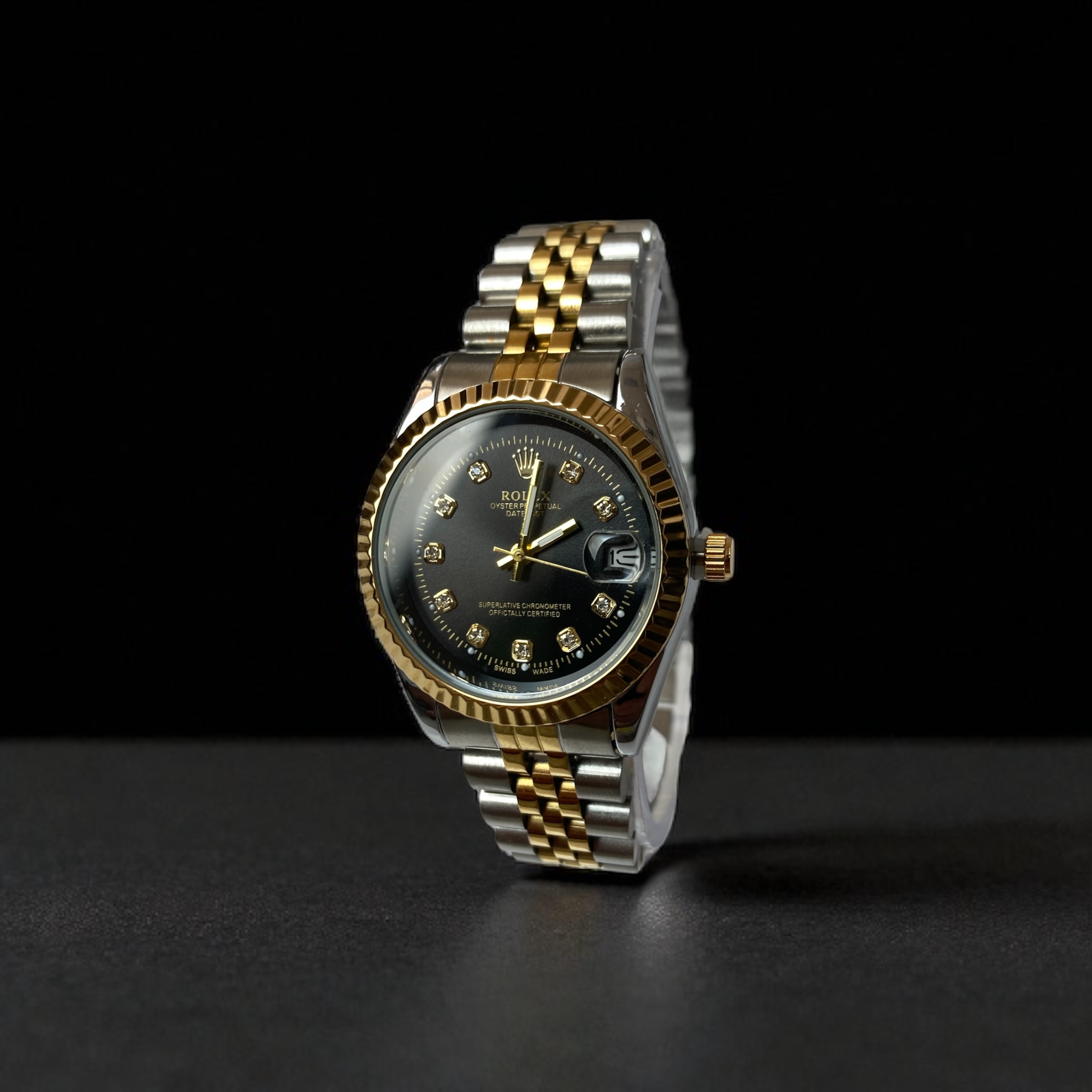 یکی از ویژگیهای بارز این ساعت، صفحه مشکی با اعداد نگیندار است. در هر ساعت (بهجز ساعت 3 که نمایش تاریخ در آن قرار دارد)، یک نگین قرار داده شده که به زیبایی و جذابیت بیشتر این ساعت کمک میکند. این طراحی باعث میشود ساعت حتی در شرایط نوری کم نیز بدرخشد.