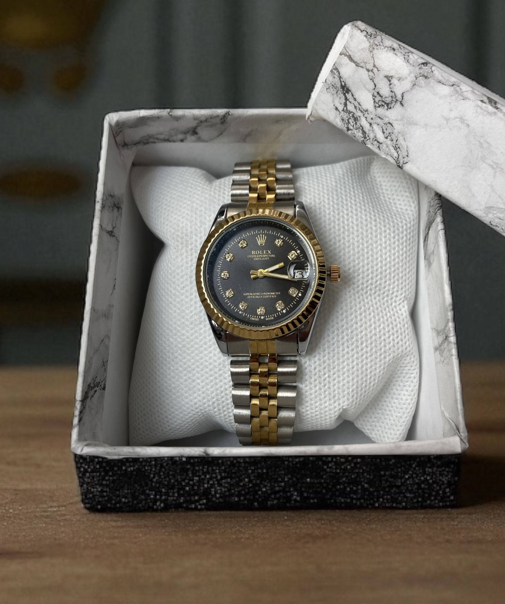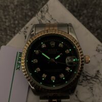 این ساعت با بدنه و بند نقره ای و طلایی، ظاهر بسیار شیکی دارد که از مدل معروف رولکس Datejust الهام گرفته شده است. طراحی خاص قاب دندانهای (Bezel) آن و صفحه مشکی با اعداد نشاندهندهی زمان به صورت نگینکاریشده، جلوهای بسیار چشمگیر به آن بخشیدهاند.