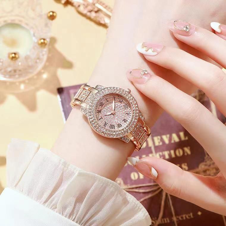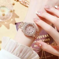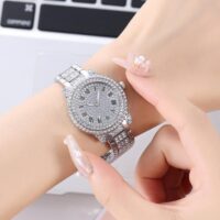 اولین چیزی که در نگاه به این ساعت به چشم میآید، طراحی کاملاً نگینکاری شده آن است. قاب گرد ساعت، بند فلزی و حتی صفحهی داخلی همگی با نگینهای درخشان تزئین شدهاند. این طراحی باعث میشود ساعت مانند یک دستبند جواهر روی دست بدرخشد و در هر نوری توجه اطرافیان را جلب کند.