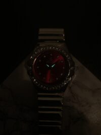 صفحه این ساعت رنگ قرمز دارد؛ رنگی که نسبت به رنگهای معمول مثل مشکی و سفید کمی متفاوتتر است و همین موضوع باعث میشود روی دست بیشتر دیده شود. عددها و نشانگرهای صفحه ساده و خوانا هستند و عقربهها هم با رنگ روشن طراحی شدهاند تا خواندن زمان راحت باشد.