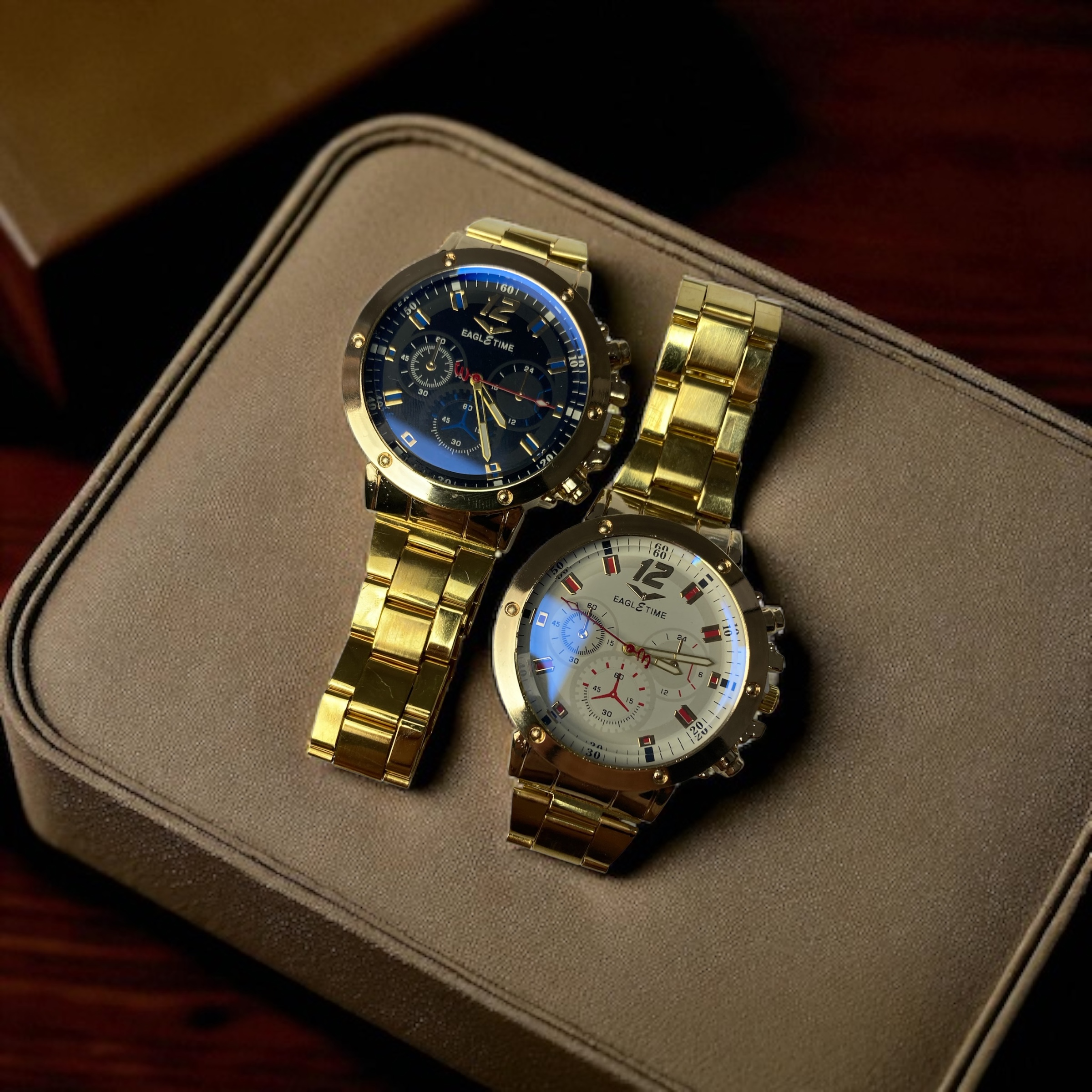 EAGLE TIME در این مدل، از ترکیب ظرافت و قدرت بهره برده است. بدنه و بند طلایی رنگ، حس لوکس و متمایزی ایجاد میکند و در نگاه اول، توجه هر بینندهای را جلب خواهد کرد. این رنگ طلایی در کنار صفحههای مشکی یا سفید، تضادی چشمنواز ایجاد کرده که هم برای محیطهای رسمی و هم برای استایل روزانه مناسب است.