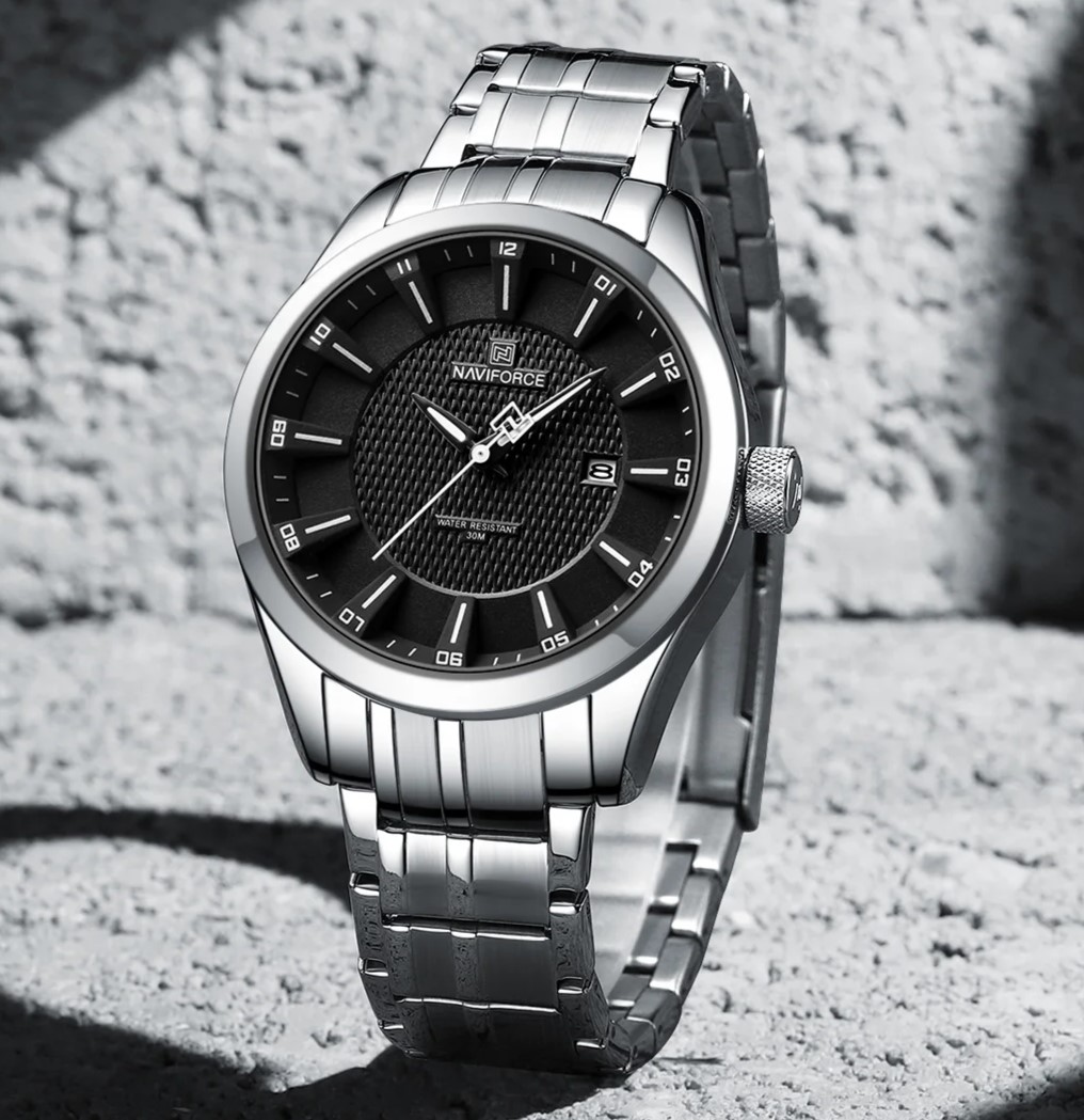 وقتی ساعت Naviforce NF8032 را روی دستت میبندی، اولین چیزی که حس میکنی، وزن متعادل و لطیف آن است. بند فلزی نرم روی مچ قرار میگیرد و قفل آن محکم بسته میشود. نگاه به صفحهٔ مشکی براق، با آن طراحی برجسته و نمایشگر تاریخ، حس حرفهای بودن را منتقل میکند. این ساعت نه فقط یک ابزار برای دیدن زمان، بلکه بخشی از استایل تو میشود.