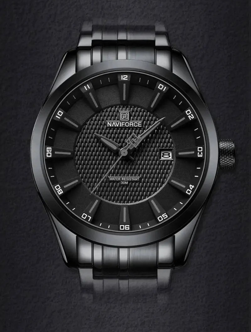 وقتی ساعت Naviforce NF8032 را روی دستت میبندی، اولین چیزی که حس میکنی، وزن متعادل و لطیف آن است. بند فلزی نرم روی مچ قرار میگیرد و قفل آن محکم بسته میشود. نگاه به صفحهٔ مشکی ، با آن طراحی برجسته و نمایشگر تاریخ، حس حرفهای بودن را منتقل میکند. این ساعت نه فقط یک ابزار برای دیدن زمان، بلکه بخشی از استایل تو میشود.