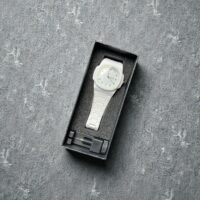 یکی از برجستهترین ویژگیهای این ساعت، استفاده از متریال فول کربن در ساخت قاب و بند است. کربن بهعنوان مادهای پیشرفته، در صنایع هوافضا، خودروسازی لوکس و تجهیزات حرفهای مورد استفاده قرار میگیرد و حضور آن در یک ساعت مچی، نشانهی نگاه فناورانه و آیندهمحور طراحان است.