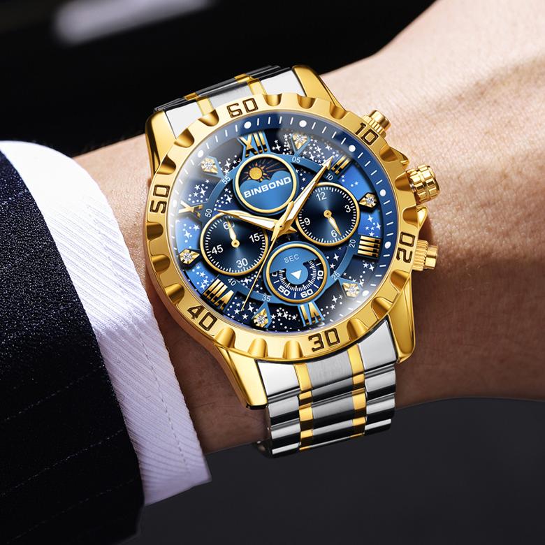 معرفی ساعت BINBOND مدل لوکس طلایی–نقرهای با صفحه آبی 🌌