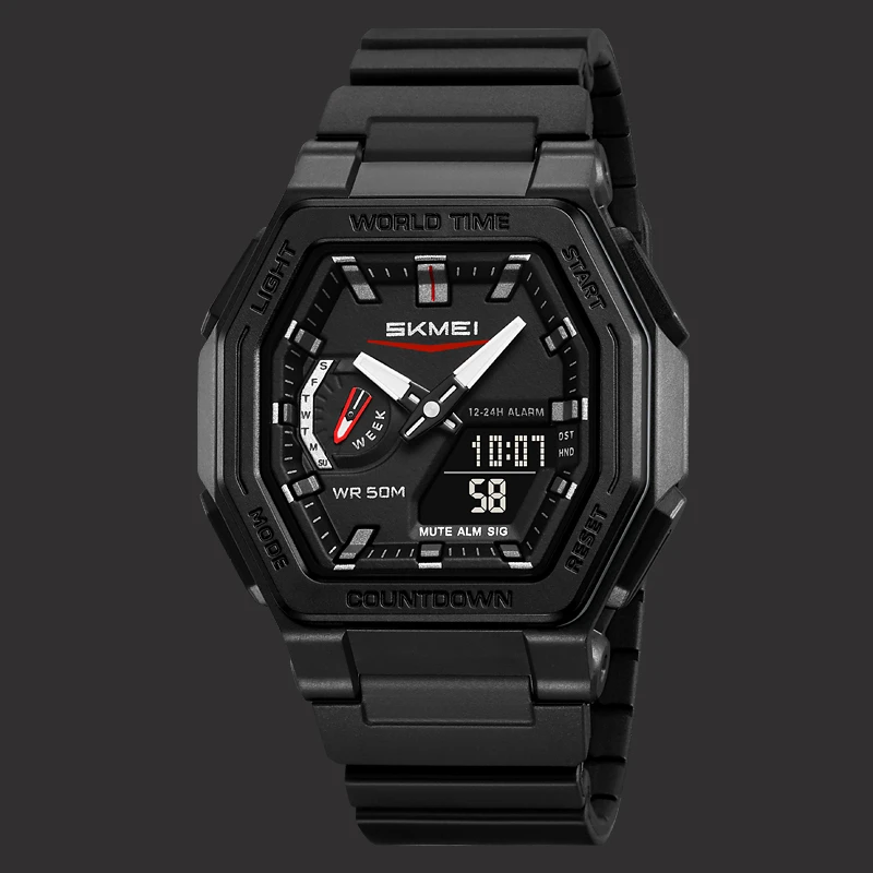 صفحهی ساعت SKMEI 2438 ترکیبی هوشمندانه از نمایش آنالوگ و دیجیتال است. عقربههای کلاسیک در کنار نمایشگر دیجیتال، تعادلی میان زیبایی سنتی و امکانات مدرن ایجاد کردهاند. این ترکیب باعث میشود کاربر بتواند هم از حس آشنای ساعتهای عقربهای لذت ببرد و هم از دقت و اطلاعات چندگانهی نمایش دیجیتال بهرهمند شود.