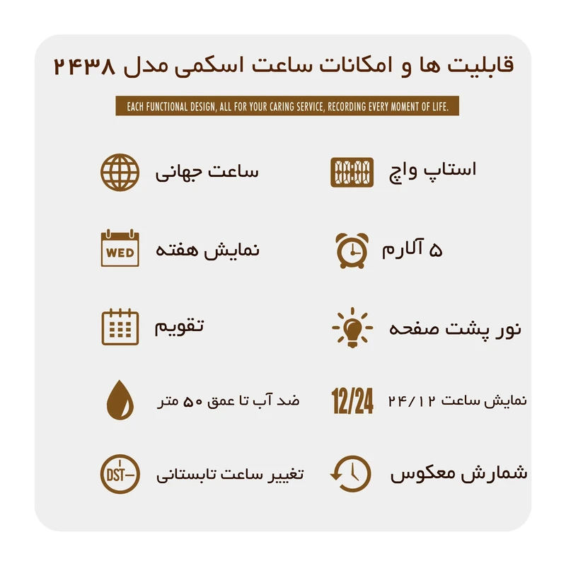 برند اسکمی سالهاست که در زمینه تولید ساعتهای اقتصادی و کاربردی فعالیت میکند. تمرکز این برند بر ارائهی امکانات متنوع، طراحی بهروز و قیمت منطقی باعث شده محصولات آن در بازار جهانی محبوبیت بالایی داشته باشند. مدل 2438 نمونهای موفق از این رویکرد است.