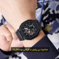 اولین ویژگی که در برخورد با این ساعت توجه را جلب میکند، طراحی بدنهی قدرتمند و زاویهدار آن است. قاب چندضلعی با لبههای برجسته، حس استحکام و دوام را منتقل میکند و یادآور تجهیزات حرفهای و نظامی است. این طراحی نهتنها جنبهی زیباییشناسی دارد، بلکه از صفحه ساعت در برابر ضربههای روزمره نیز محافظت میکند.