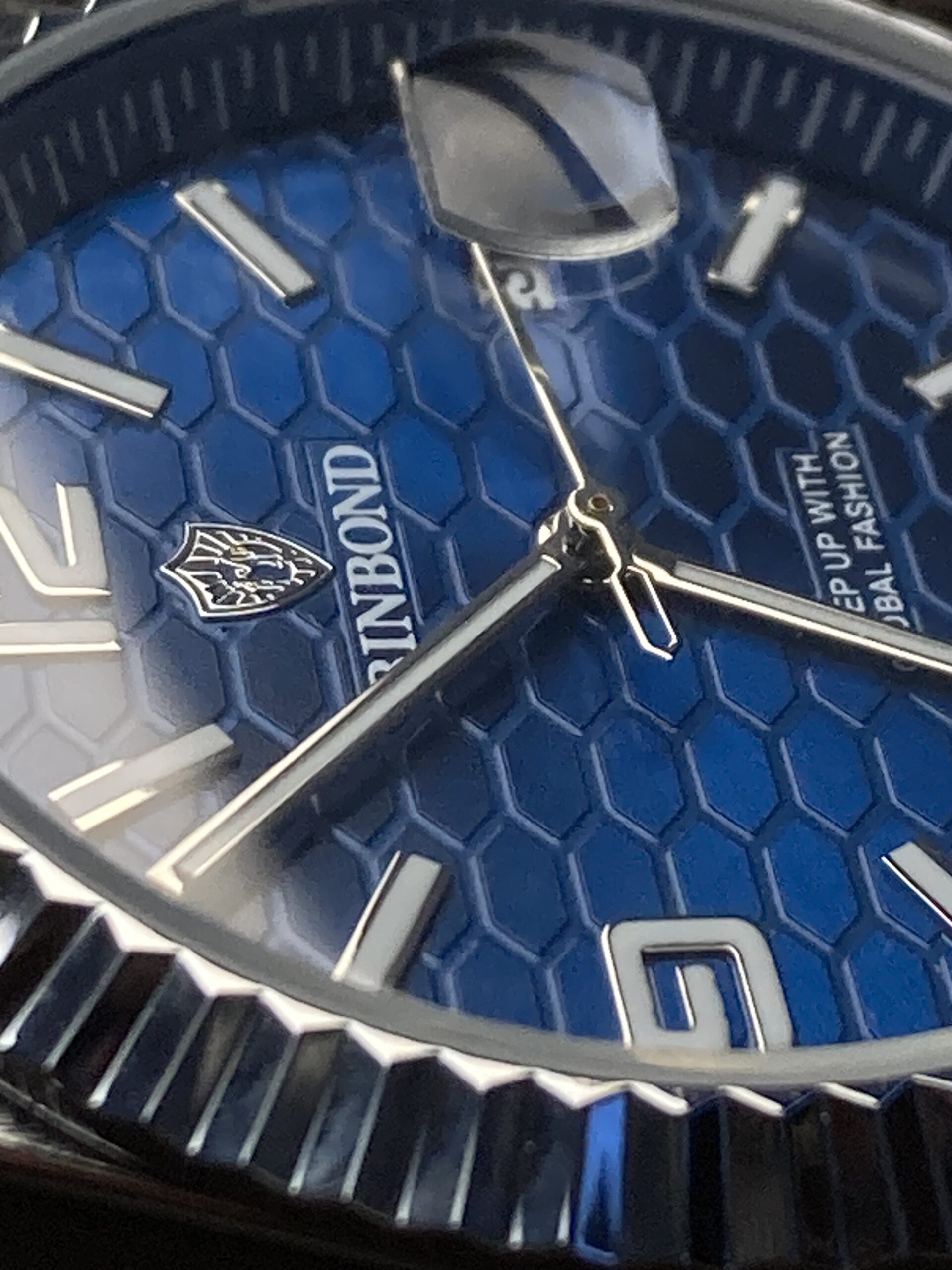 این مدل BINBOND دارای نمایشگر تاریخ است که در موقعیت ساعت ۳ قرار گرفته. تاریخ با فونت خوانا و اندازه مناسب نمایش داده می‌شود تا کاربر بتواند در یک نگاه، علاوه بر زمان، تاریخ روز را نیز مشاهده کند.
