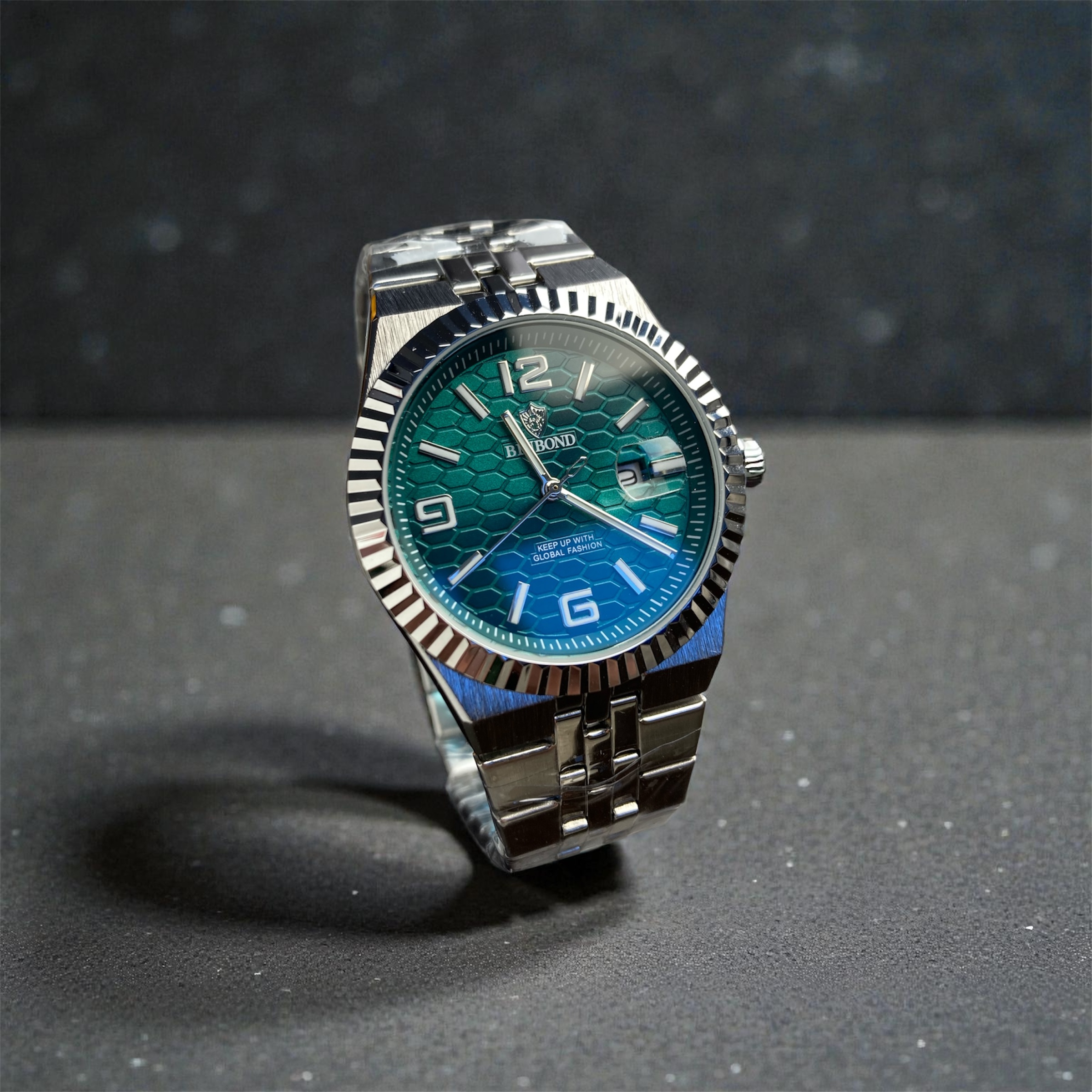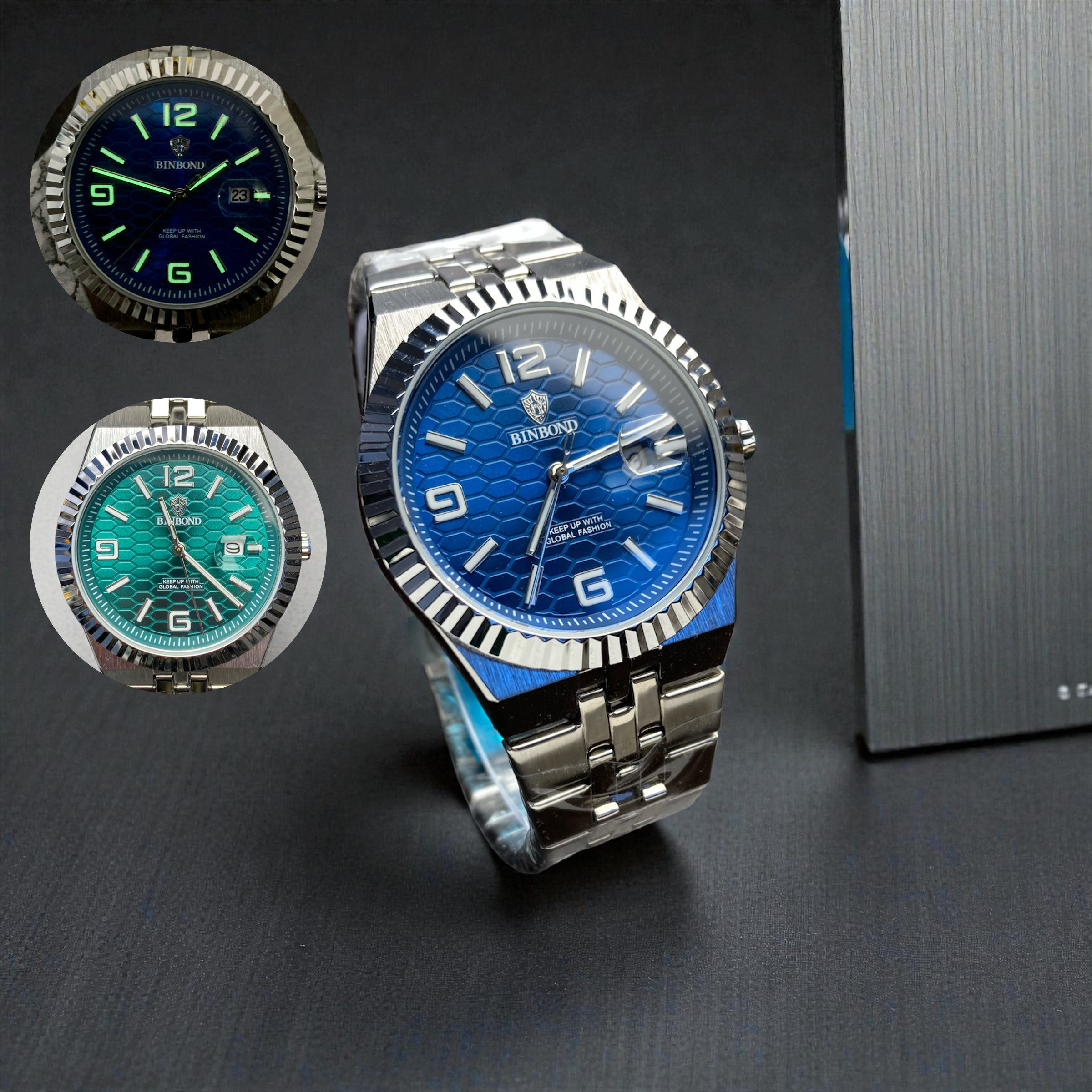 ساعتی که در تصویر مشاهده می‌کنید، یکی از مدل‌های جذاب و پرفروش برند BINBOND است؛ ساعتی فول استیل، تاریخ‌دار، شب‌نما که در دو رنگ صفحه سبز و آبی عرضه می‌شود و با طراحی خاص صفحه و بند فلزی چشم‌نواز، توجه هر بیننده‌ای را به خود جلب می‌کند.