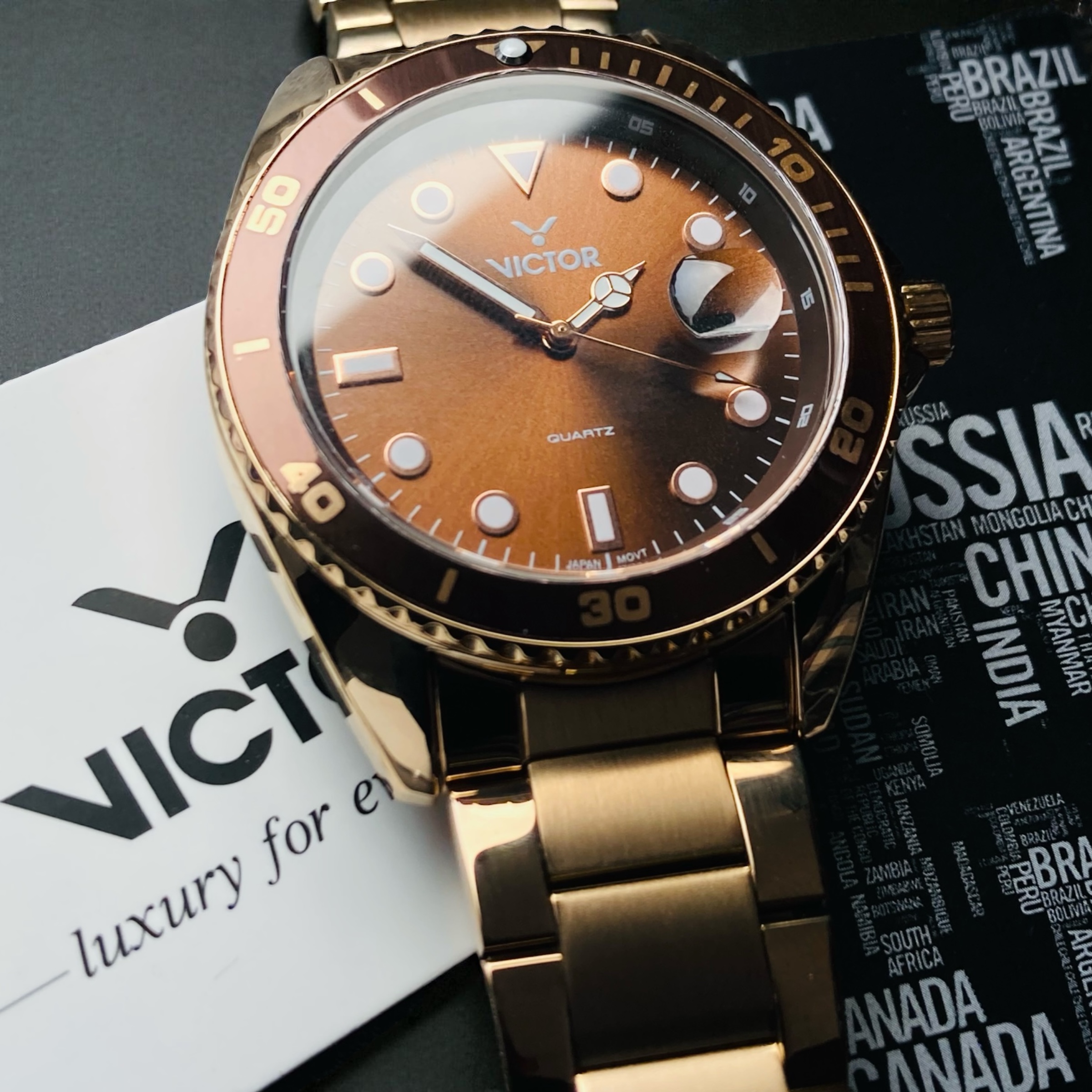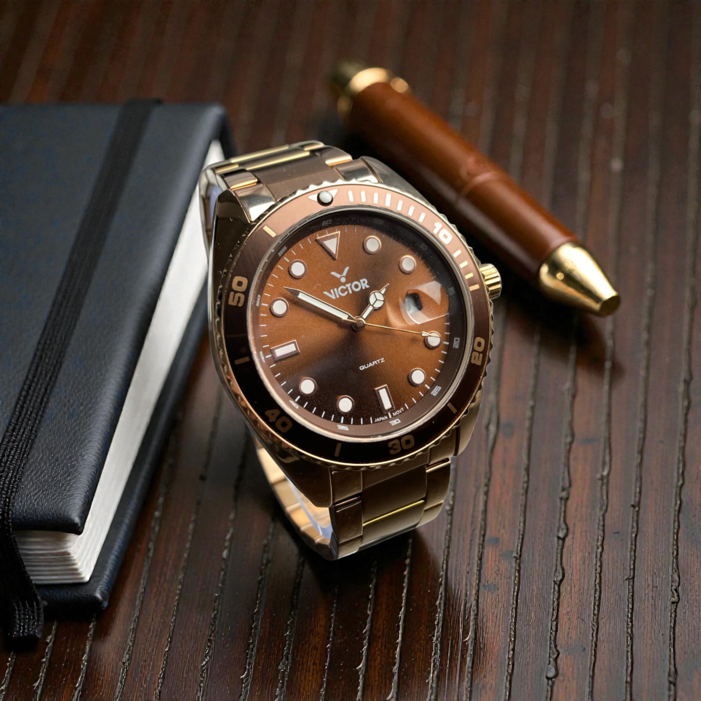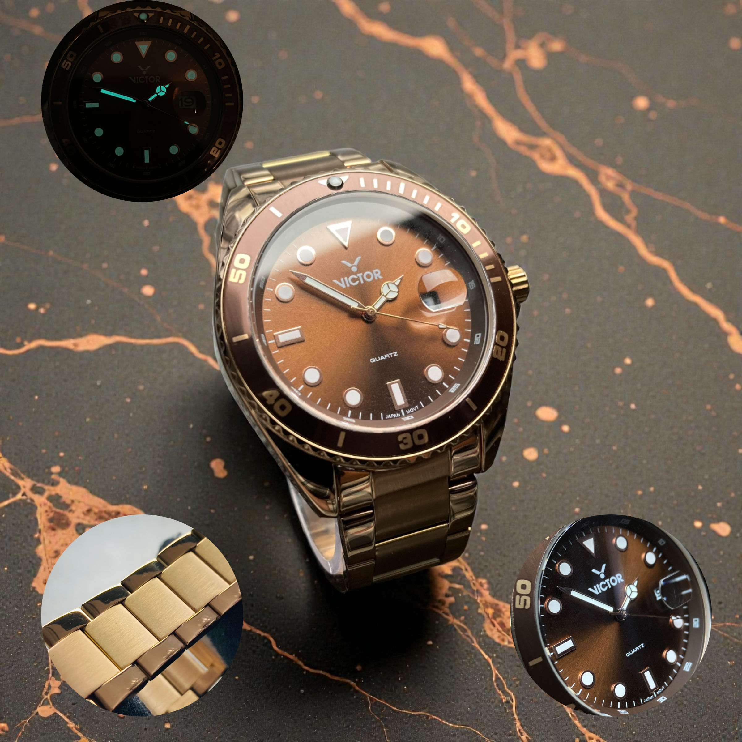 ساعتی که در تصویر مشاهده میشود، نمونهای شاخص از ساعتهای برند ویکتور (Victor) است؛ برندی که در طراحی ساعتهای کلاسیک–اسپرت با تمرکز بر کیفیت ساخت، دوام بالا و ظاهر شیک شناخته میشود. این ساعت با ترکیب بدنه فول استیل، صفحهای گرم با تناژ قهوهای، قاب چرخان اسپرت و جزئیات دقیق، انتخابی مناسب برای افرادی است که به ظاهر حرفهای و در عین حال کاربردی اهمیت میدهند.