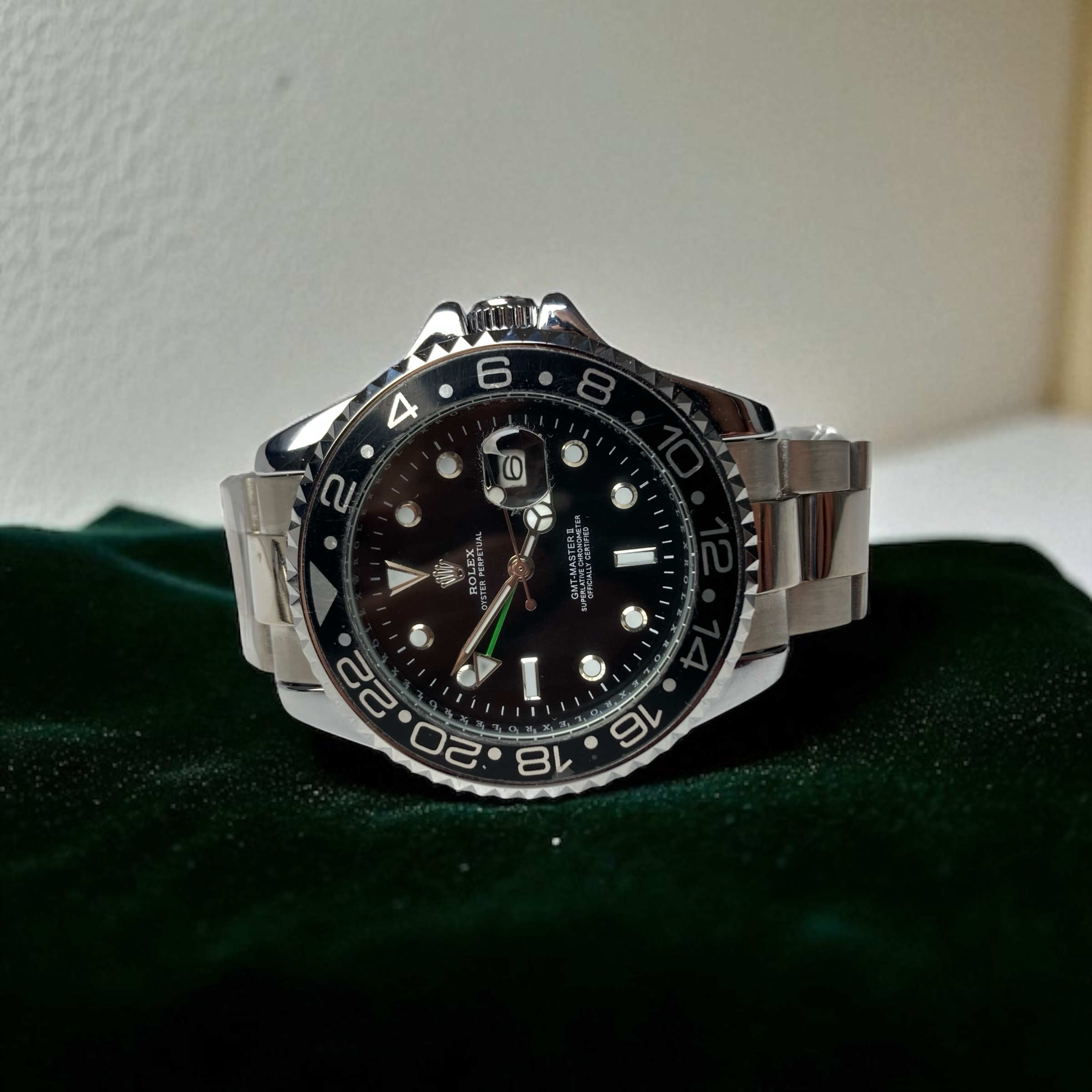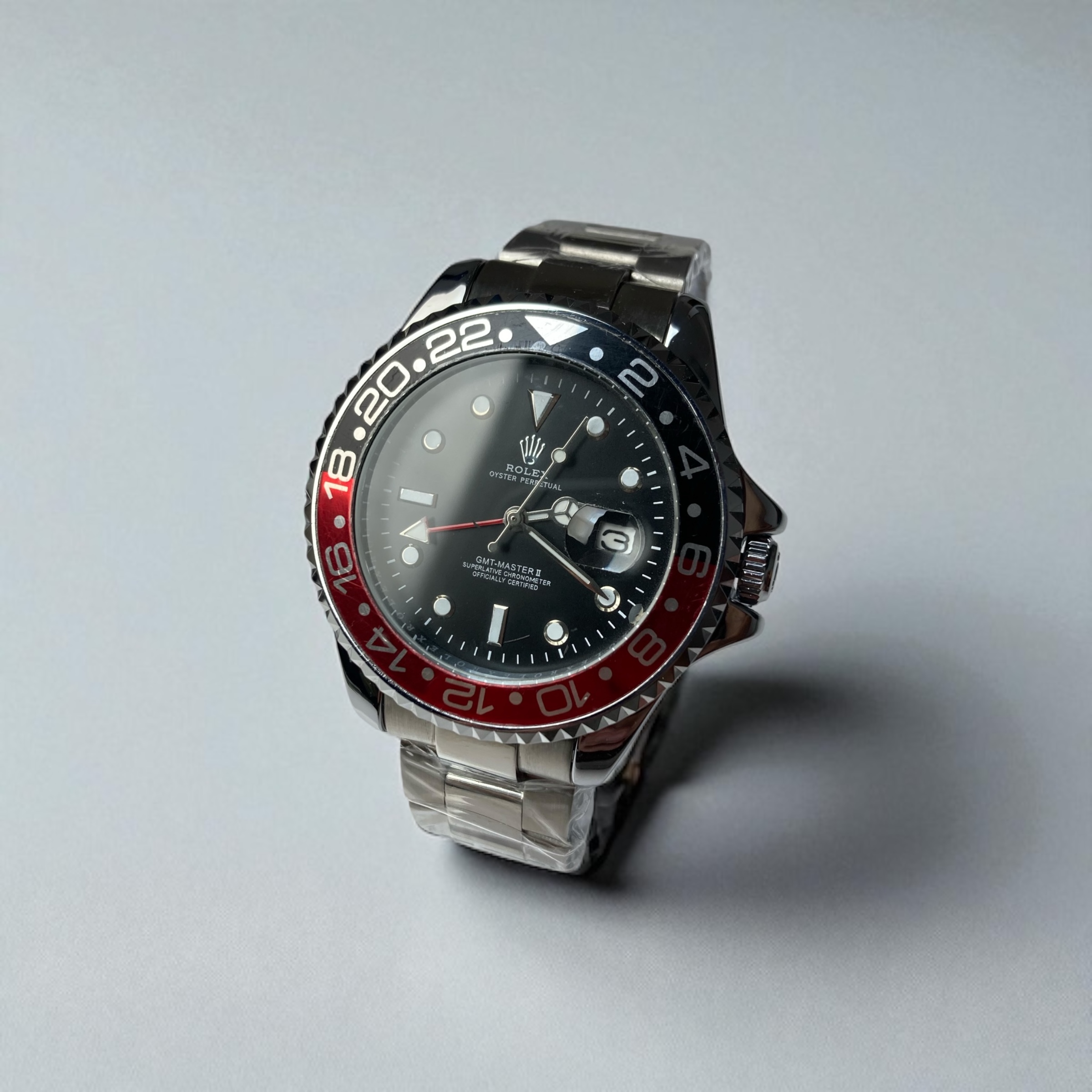 یکی از برجستهترین مدلهای رولکس، GMT-Master II است که در ابتدا برای خلبانان طراحی شد و بعدها به یکی از محبوبترین ساعتهای کلکسیونی و کاربردی در دنیا بدل گشت. تصویری که مشاهده میکنیم نیز نمونهای از همین خانواده است؛ ساعتی با قاب استیل ضدزنگ، نمایشگر شبتاب، قابلیت دوزمانه (GMT)، تاریخدار، و در دو ترکیب رنگی جذاب با حاشیهی مشکی-قرمز و مشکی-مشکی. این ساعت با قفل اختصاصی رولکس (Rolex Oysterlock) عرضه میشود که امنیت و راحتی را همزمان تضمین میکند.