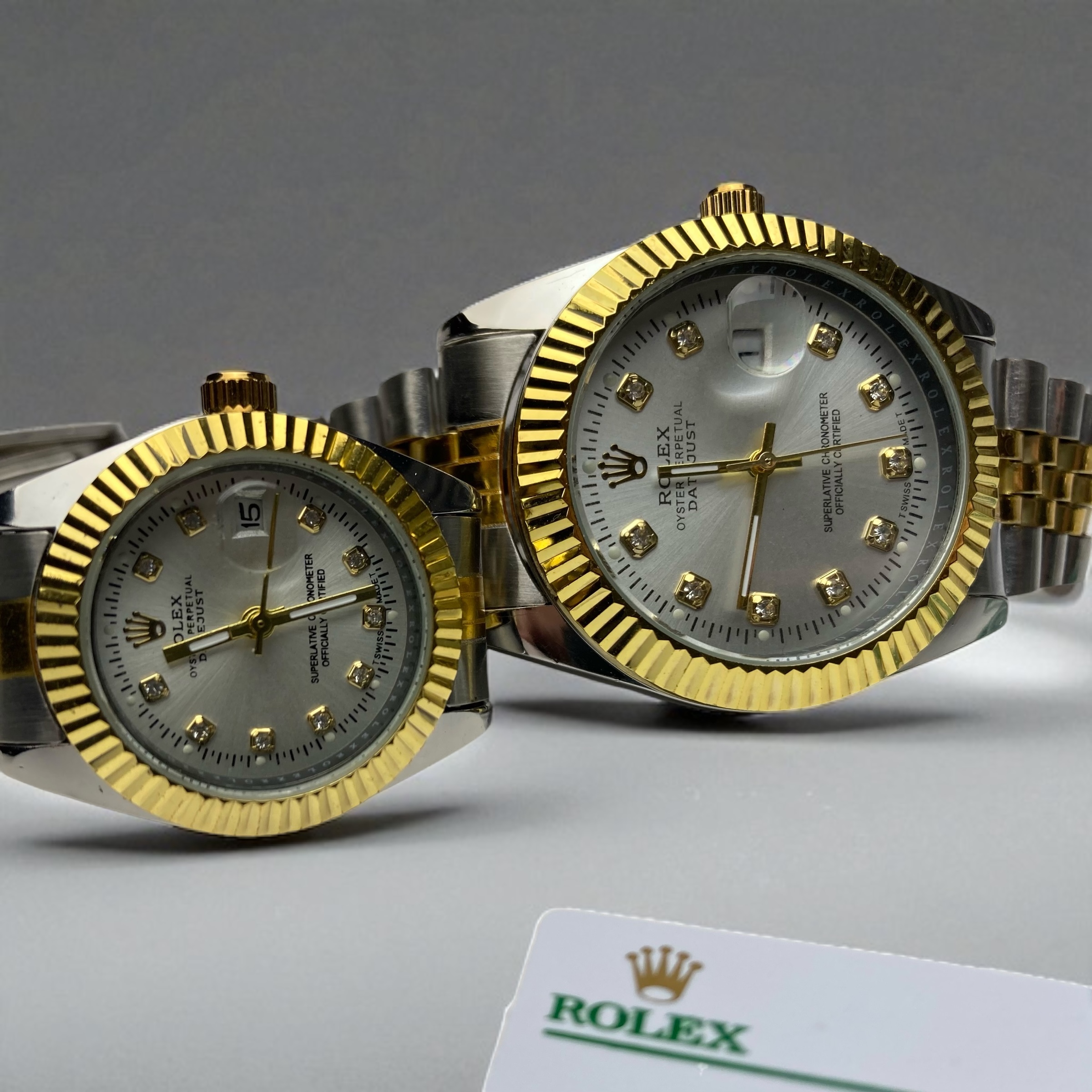 ست ساعت مچی زنانه و مردانه با طراحی استیل نقرهای و طلایی، صفحه نقرهای نگیندار و قاب طلایی، ترکیبی از ظرافت و جذابیت را ارائه میدهد. این ست انتخابی ایدهآل برای زوجهایی است که به دنبال یک ساعت شیک، هماهنگ و ماندگار هستند.
