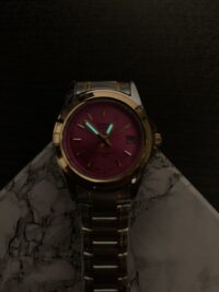علاوه بر رنگ صفحه‌ای که در عکس دیده می‌شود، این مدل یک نسخه با صفحه صورتی نیز دارد. رنگ صورتی برای کسانی که دنبال ساعت با ظاهر لطیف‌تر و زنانه‌تر هستند انتخاب خوبی است. هر دو رنگ روی بند نقره‌ای و طلایی کاملاً هماهنگ می‌نشینند و از نظر استایل مشکلی ایجاد نمی‌کنند.