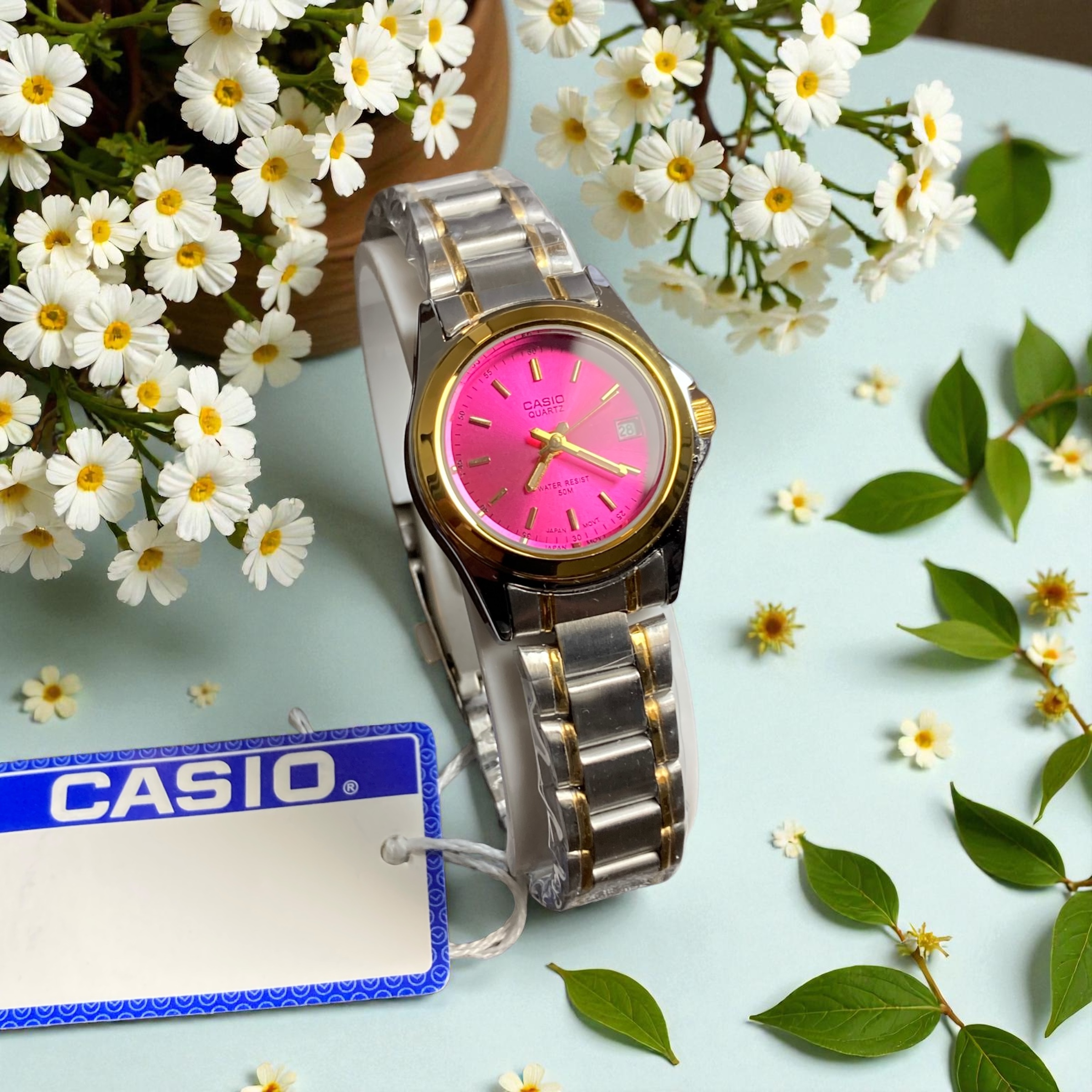 این مدل یک ساعت زنانه از برند کاسیو است که طراحی آن به ساعت‌های اصلی برند خیلی نزدیک است. کیفیت ساخت ساعت در حدی است که از نظر ظاهر و حس روی دست تفاوت زیادی با مدل اصلی ندارد. بدنه و بند ساعت هر دو استیل هستند و همین موضوع باعث شده برای استفاده روزمره انتخابی مطمئن باشد. این مدل علاوه بر رنگ صفحه‌ای که در تصویر دیده می‌شود، صفحه صورتی هم دارد و همین گزینه دوم برای کسانی که رنگ‌های لطیف‌تر دوست دارند مناسب است.